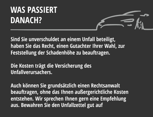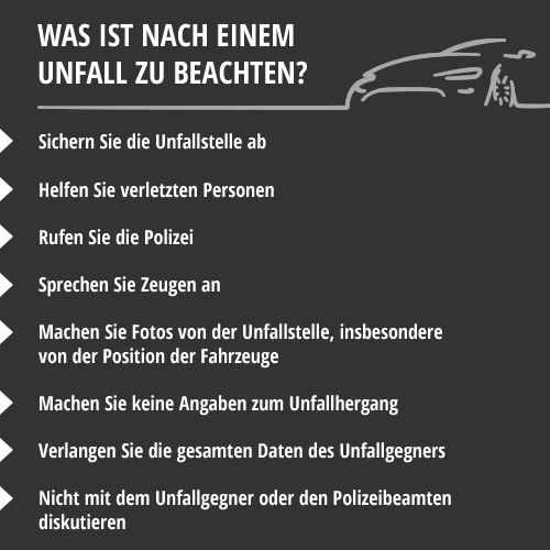 Was müssen Sie nach dem Unfall beachten? Hier finden Sie ein paar erste Tipps, für alles weitere beraten wir Sie gerne im Detail.
