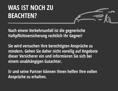 Nach einem Verkehrsunfall ist die gegnerische Haftpflicht- versicherung rechtlich Ihr Gegner! Gehen Sie daher nicht voreilig auf Angebote dieser Versicherer ein!