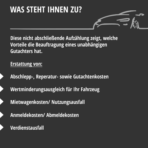 Sind Sie unverschuldet an einem Unfall beteiligt, haben Sie das Recht, einen Gutachter Ihrer Wahl, zur Feststellung der Schadenhöhe zu beauftragen.